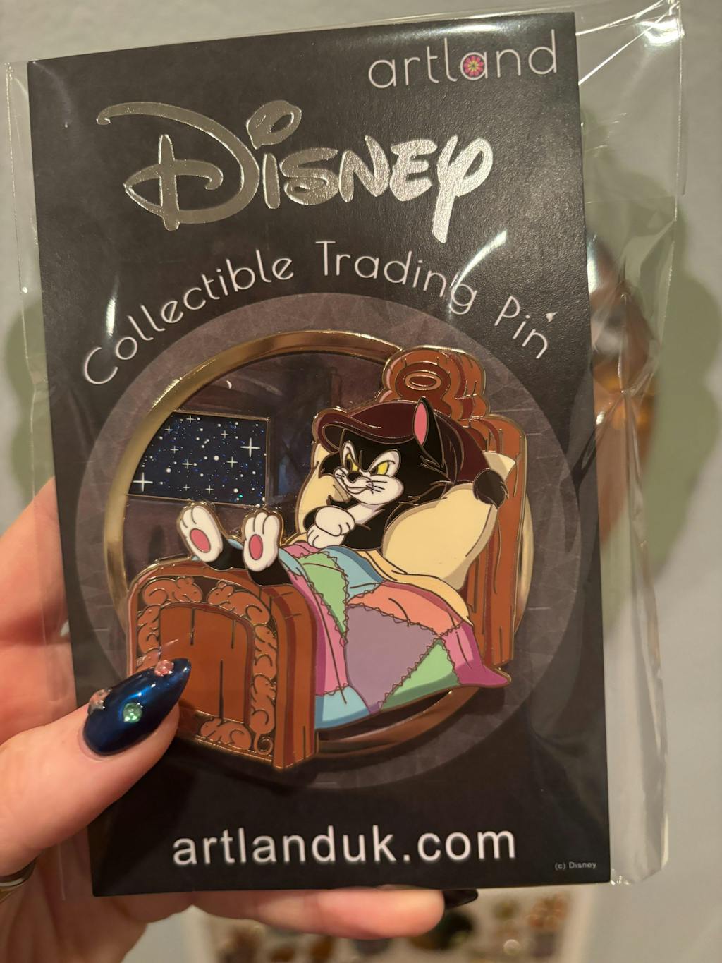 Interrupted Cat Nap is a pin on pin design featuring Figaro looking grumpy in his little bed and patched blanket as a pin layer on top of a background of Gepetto's home with a window to a beautiful, glittering night sky.